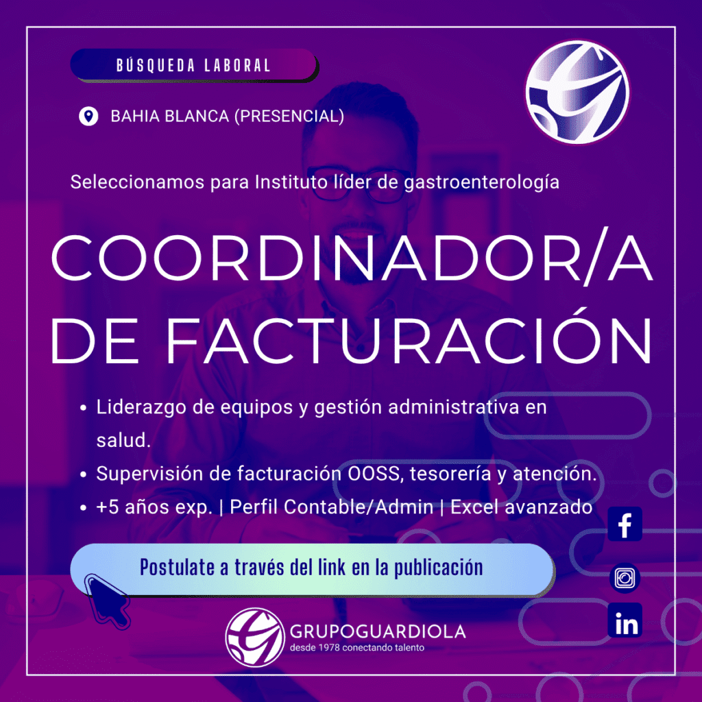 🔊 Grupo Guardiola selecciona Coordinador/a del área de facturación en Bahía Blanca para instituto de gastroenterologia y salud digestiva. Buscamos profesionales con experiencia en salud. 👉 ¡Conoce los requisitos y postúlate!