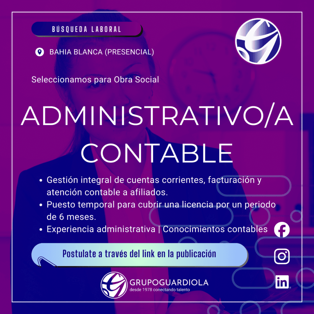 🌟 Grupo Guardiola busca un perfil Administrativo con sólida experiencia contable para cubrir una licencia de 6 meses en una Obra Social. 📑 Conocé más y postulate